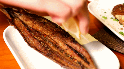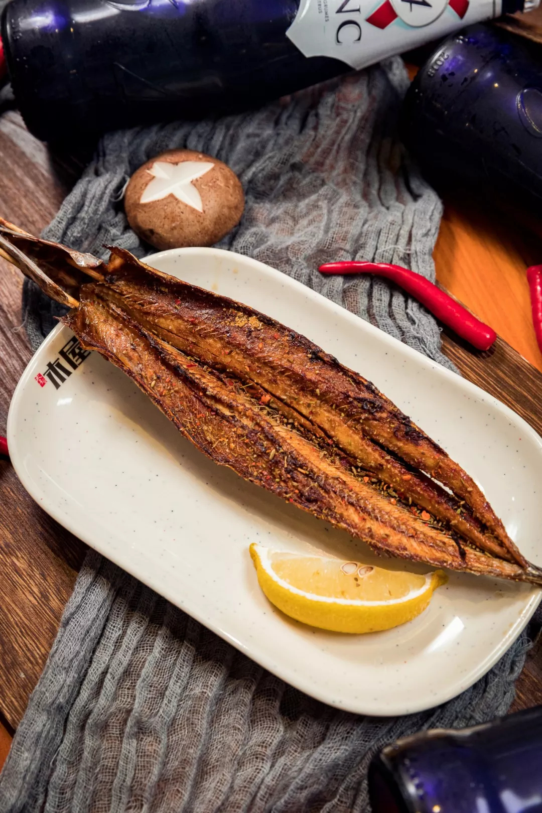 秋刀鱼烤得皮焦肉嫩,酸咸适中